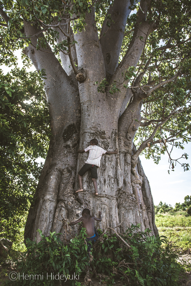 バオバブの巨木に登って遊ぶ子供たち。こっちの木登りって、すごい。